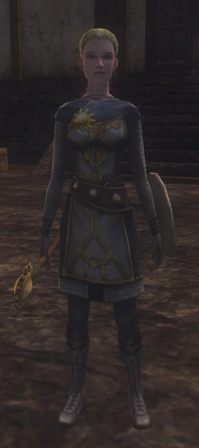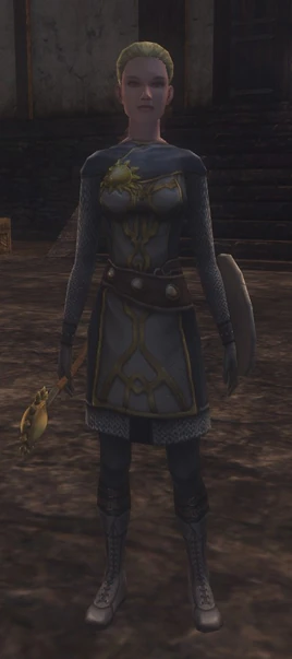 Adara was a light-skinned human woman who wore her blonde hair tied back. In the field, she wore a suit of chain mail, and carried a buckler and mace-like holy symbol of Amaunator.[1]