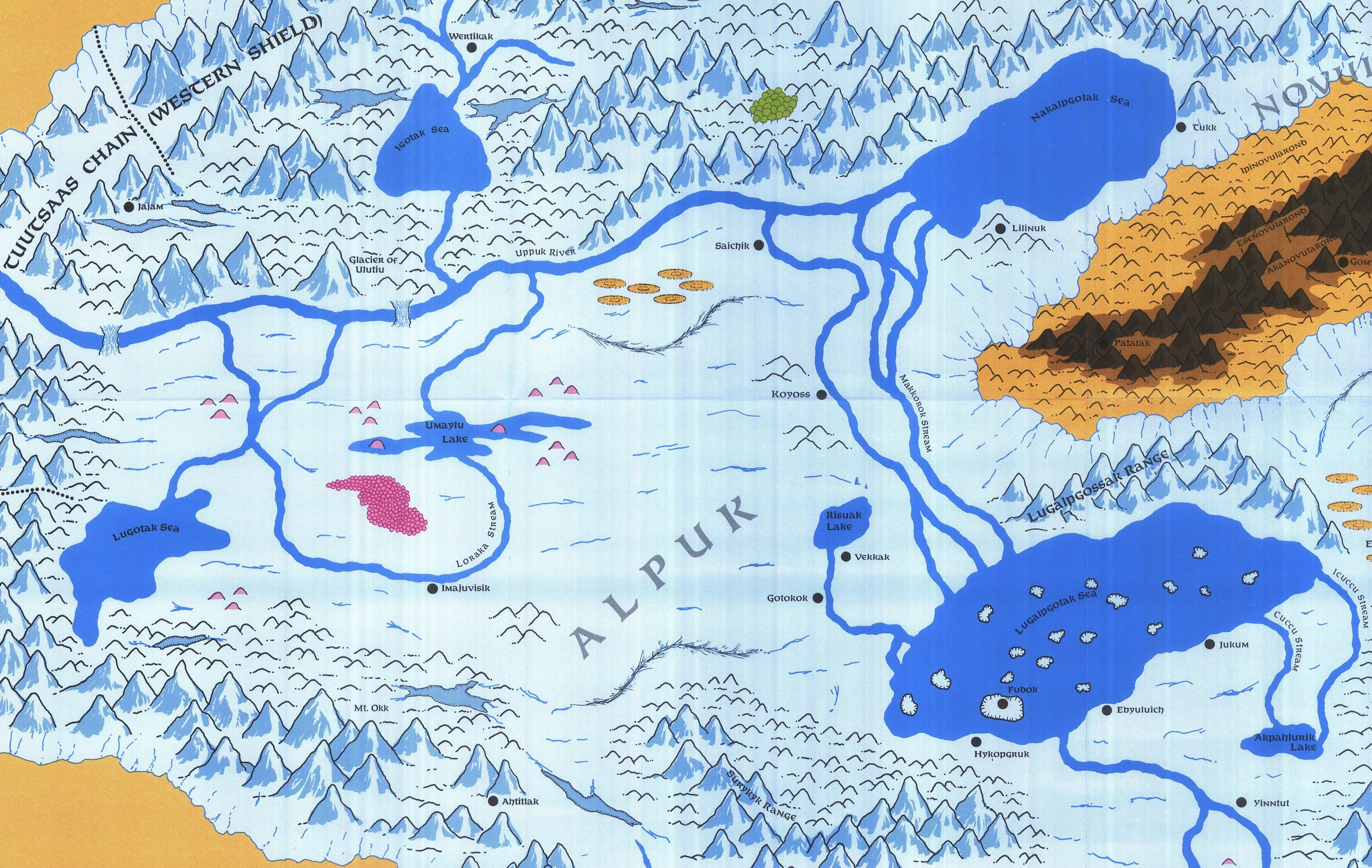 Alpuk encompassed the two largest seas in the Great Glacier, the Nakalpgotak and the Lugalpgotak. The mysterious mountainous region known as Novularond, home of frost giants and arctic dwarves,[3] was also within its borders.[1]