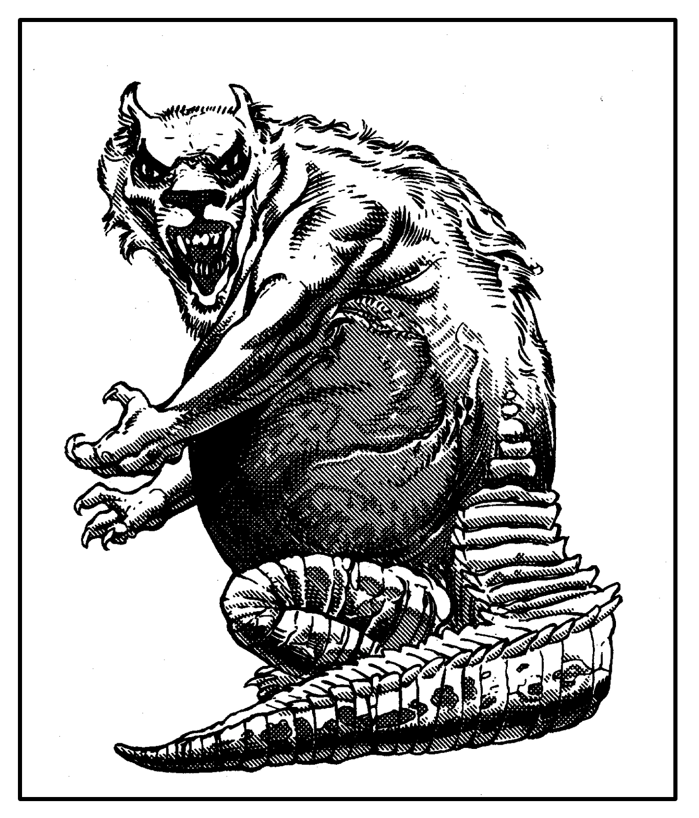 These creatures were a cross between a crocodile, a lioness, and a hippopotamus in mannish form. Their tail and legs were like a crocodile, belly and neck were from a hippo, and they had lionlike arms and head. The typical ammut was 12 ft (3.7 m) in length.[1]