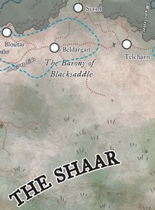 Blacksaddle was a kingdom filled with small hills and roughly triangular in shape, with the towns of Bloutar, Syrnt and Telcharn marking each corner of the triangular border. the southern border was marked by the Shaarwall, a strip of hills separating the Border Kingdoms and the Shaar. Blacksaddle Keep was located in central Blacksaddle.[1]