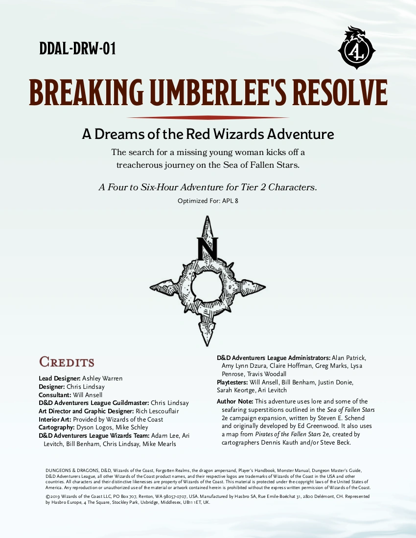 - ↑ Ashley Warren, Chris Lindsay (June 2019). Breaking Umberlee's Resolve (DDAL-DRW01) (PDF). D&D Adventurers League: Dreams of the Red Wizards (Wizards of the Coast), p. 1.