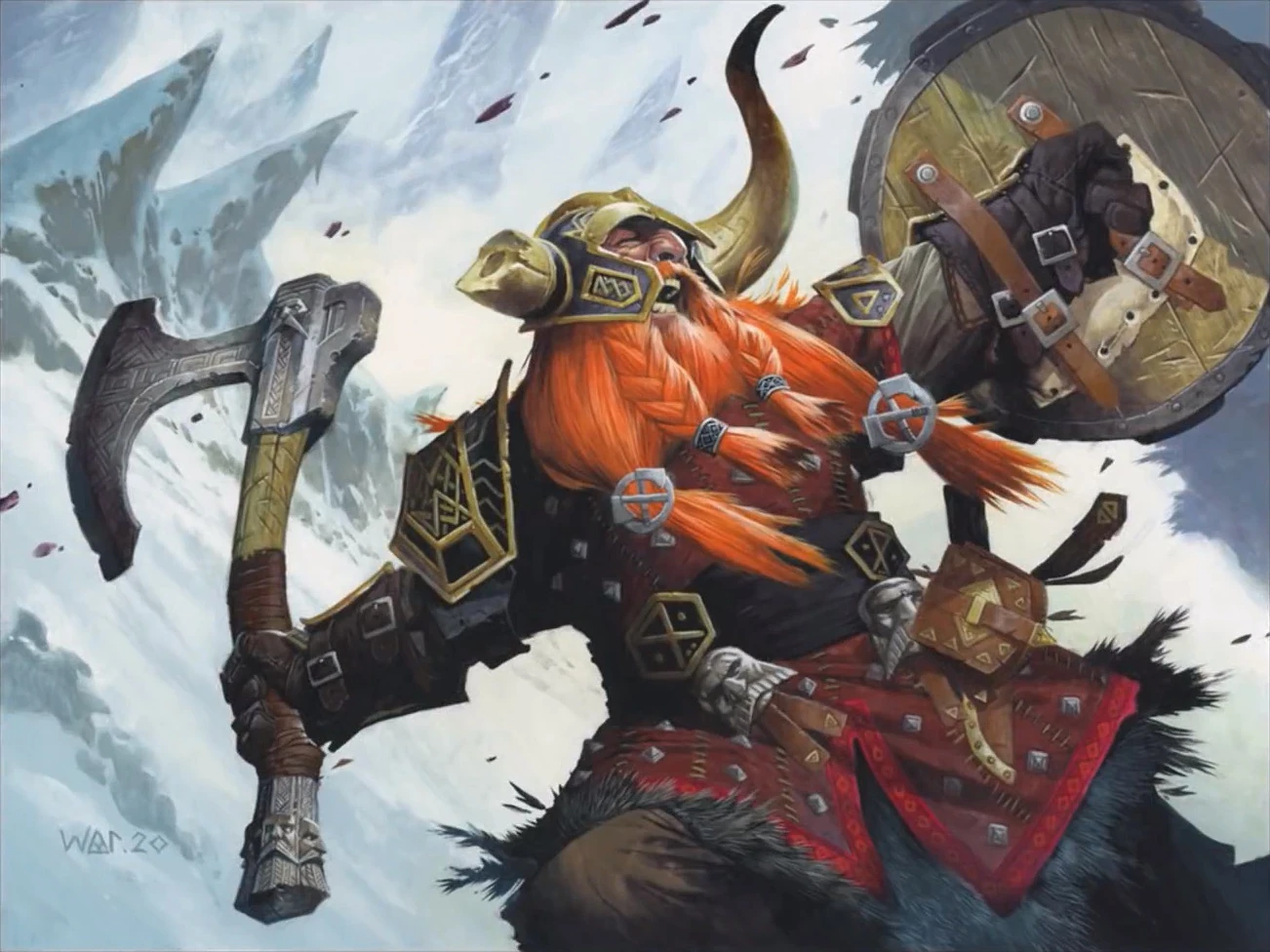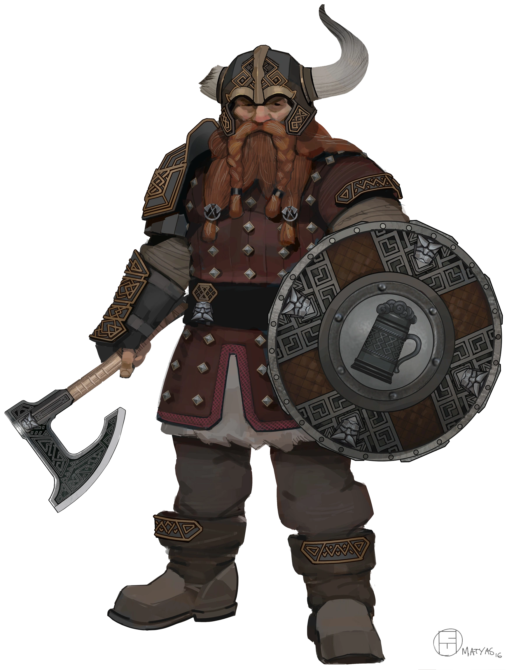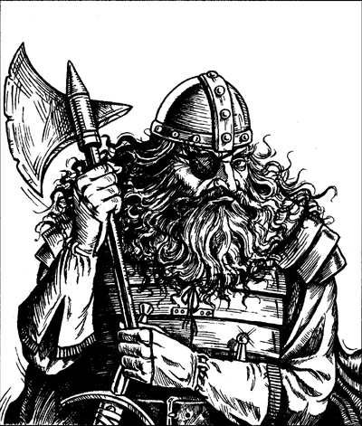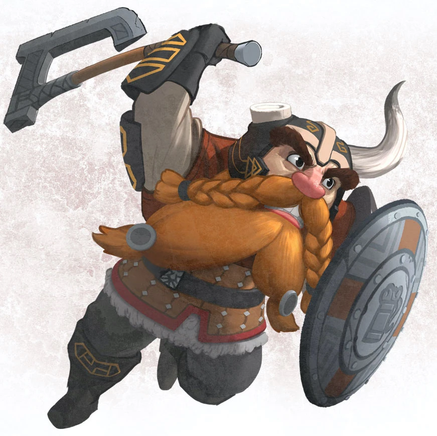 Bruenor with notched axe and a (hornless) helm.