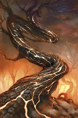 The trees that filled this forest were blackened and glowing, in a perpetual state of burning ever since they were saplings. Some of these trees—known as ash trees—seemed sentient and quite angry, known to lash out at those who came near them.[1]