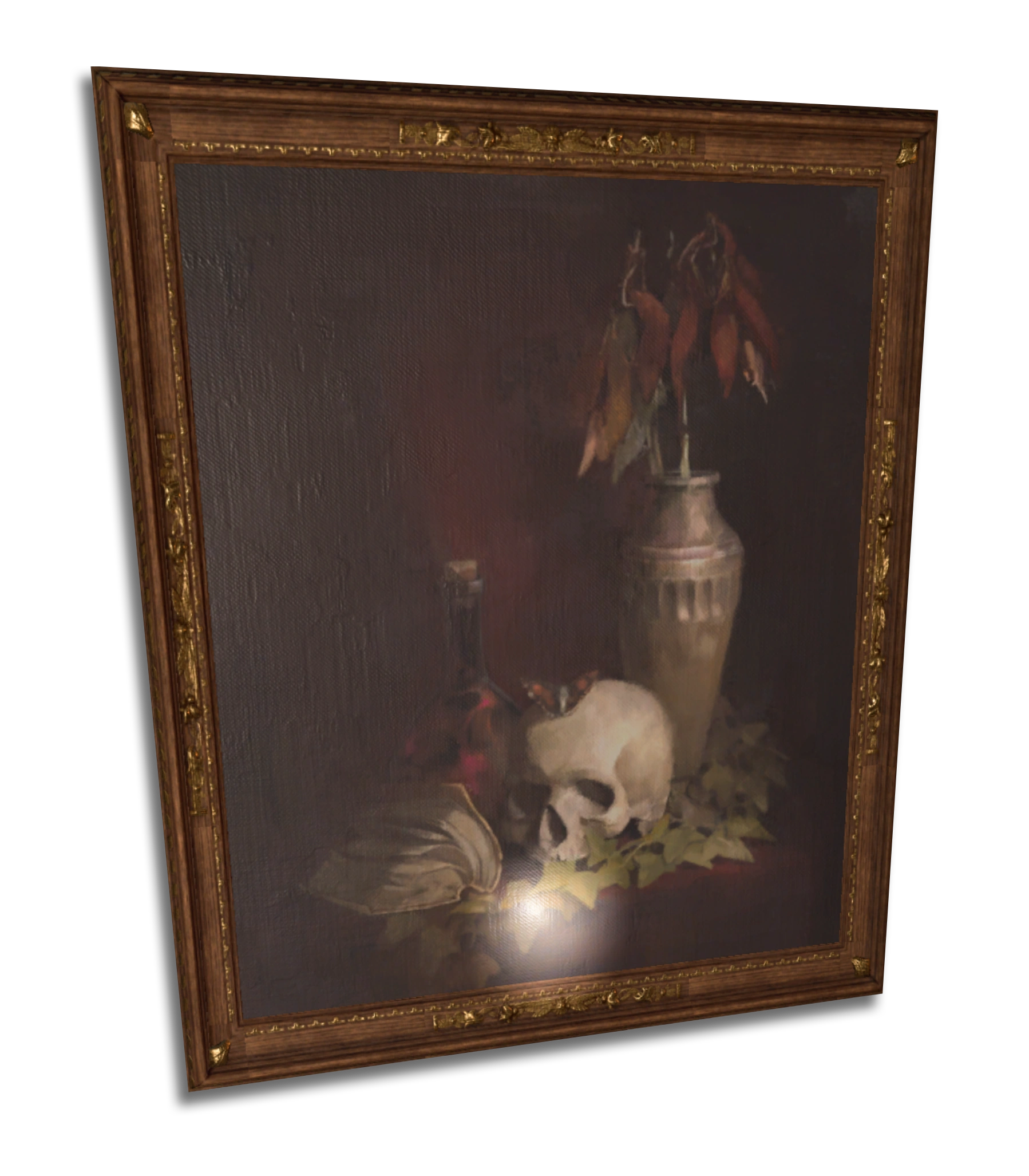 A painting depicting a butterfly perched atop a skull.