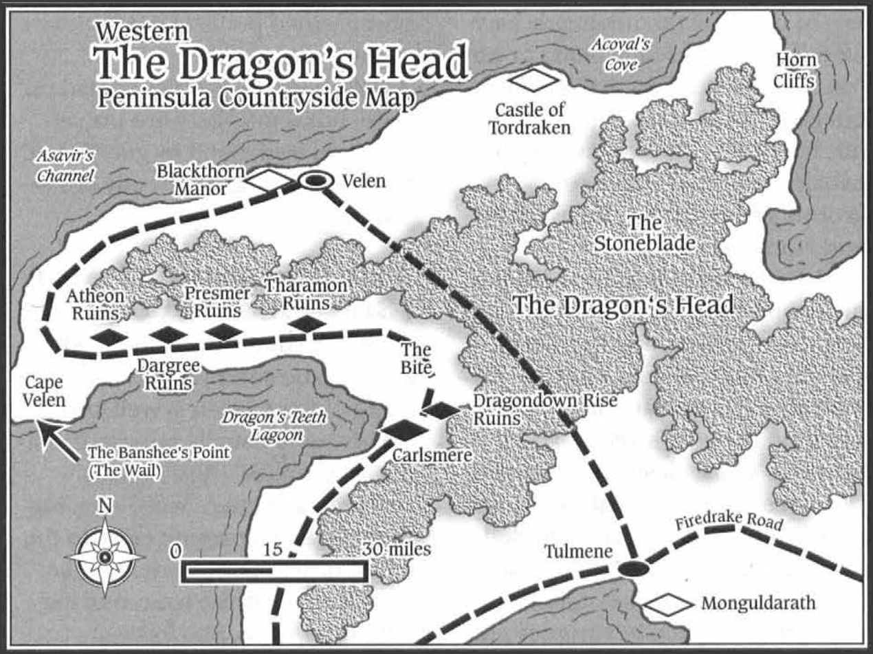 Cape Velen encompassed the Dragon's Neck Peninsula, which was also called the Velen Peninsula or the Tethyr Peninsula.[2][5] Most of the settled land was on the coast; the interior of the peninsula was forested and connected to the Forest of Tethir to the east.[6]