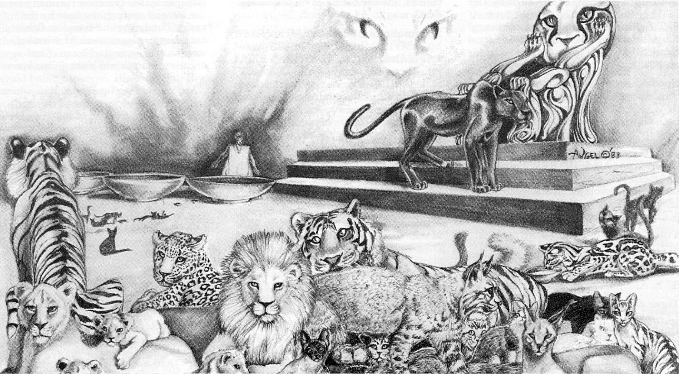 A variety of domesticated cats lounge alongside other species of feline inside a temple of Bast
