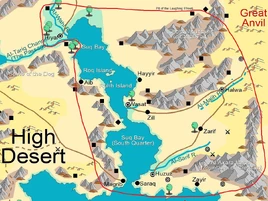 They lay at the center of the continent of Zakhara geographically, but even more so in importance.[1] They contained the largest population of any Zakharan region,[4] and while Wasat's and Halwa's role was mainly to connect the cities to each other[5] and with the wild hinterland of the Haunted Lands,[6] respectively, Hiyal was the continent's largest industrial center,[7] and Golden Huzuz not only functioned as the capital from which the Grand Caliph ruled all of Zakhara,[8] but was its historical,[1] religious, and cultural center as well.[9]