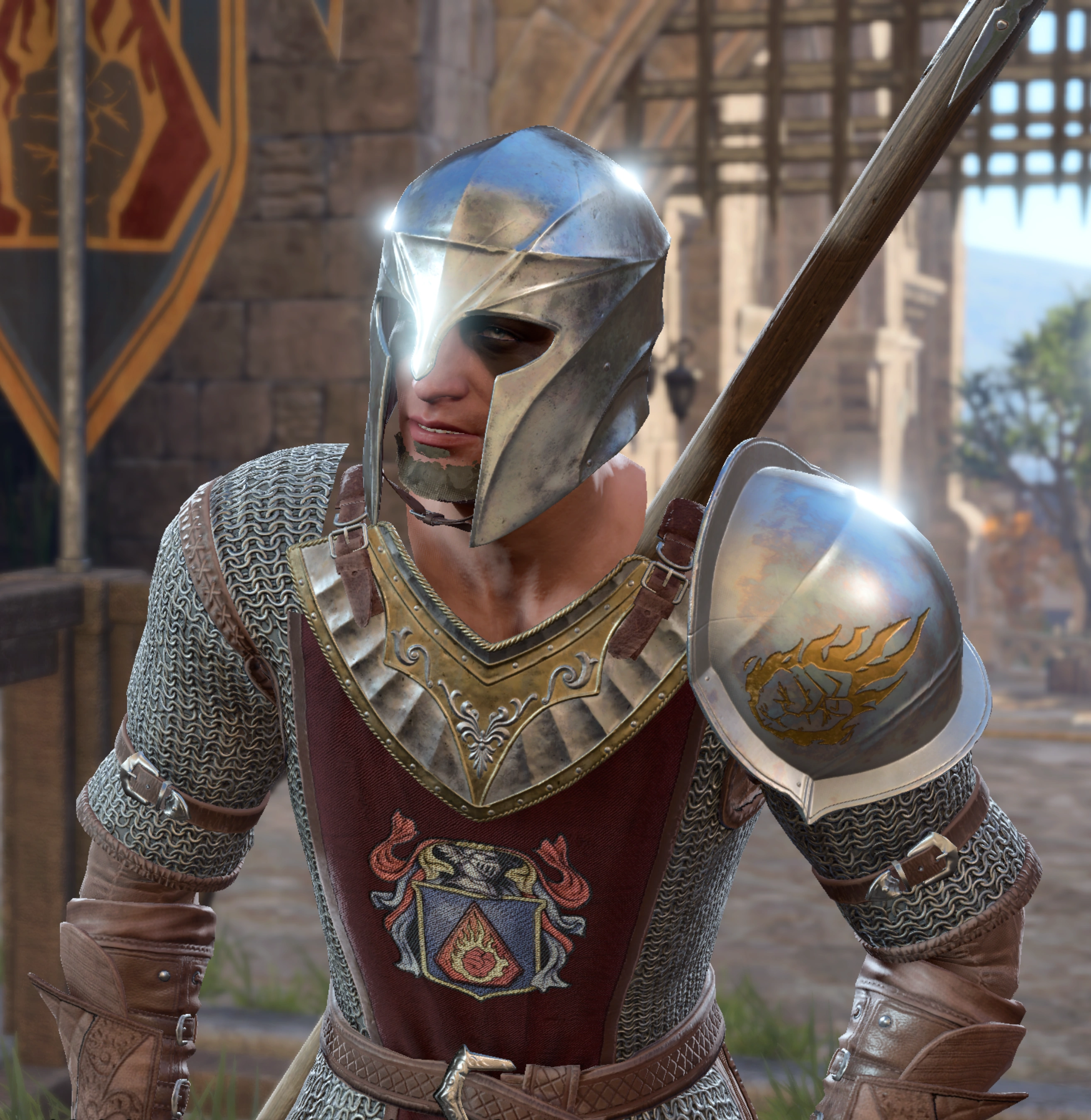 Crosse was a human man with tan skin and mousy-colored hair. His face was decorated with black paint or black tattoos. The man's blue eyes shone from under his Fist uniform helmet. He wore a set of chainmail armor decorated with a tabard embroidered with the Flaming Fist insignia. Crosse wielded a halberd when on duty.[1]