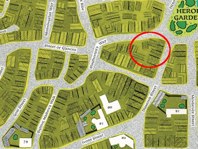 The Deepwinter estate was located on the corner of Staghunter's Way and Diamond Street in the Sea Ward, just across Heroes' Walk from Heroes' Garden. Much of it was destroyed in a maliciously set fire in 1260 DR.[1]