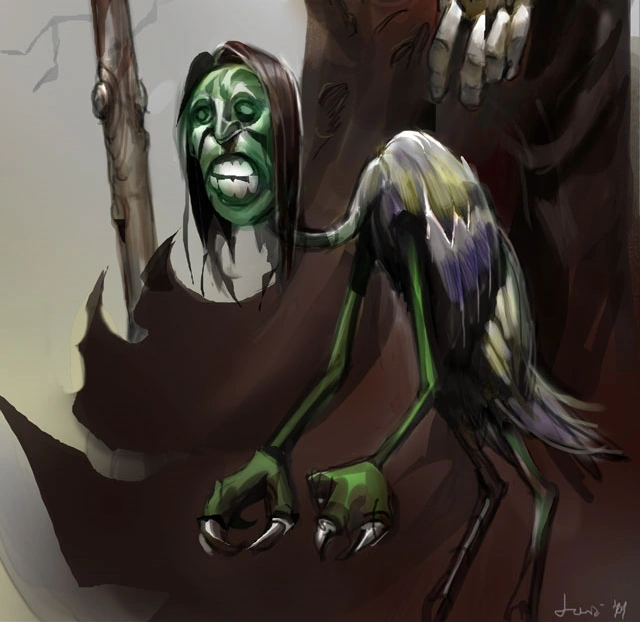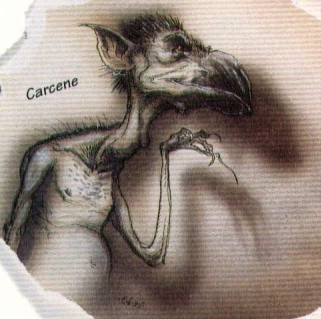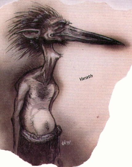 The varath were taller and stork-like, their vaguely human faces sported long bills, and their arms were thin. They also gave out loon-like cries, leading them to be dubbed "screechers" in the cant of Sigil. Meanwhile, the carcene were short and broad, resembling more of a squat pelican with a foreshortened bill. Unlike the varath, their cries were more in the vein of gobbling croaks and caws.[2][3]