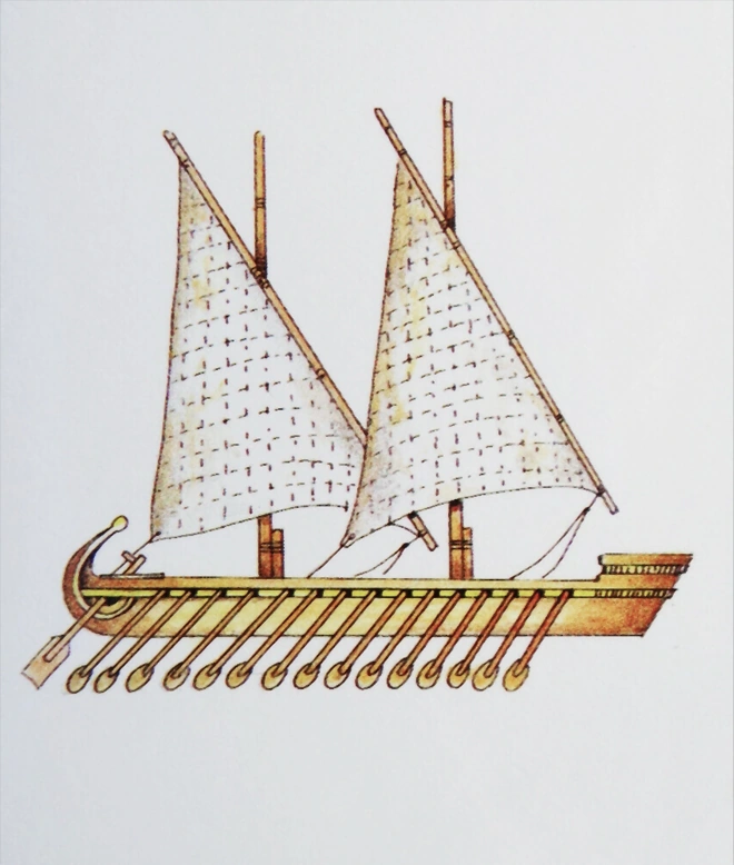 The rowers were fully protected from attacks by a full deck.[3] Fore-, mid-, and sterncastles could each be mounted with a large weapon (such as a catapult or ballista) and a ram could be extended out from the bow just above the water line.[1][3]