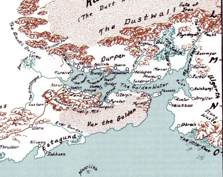 The Dustwall Mountains marked the northern borders of the lands of Durpar, Var, and Estagund, and of Ulgarth, separating them from the forbidding lands of the Dust Desert.[11][2] They shielded the southern lands against the raging sandstorms.[5][3]