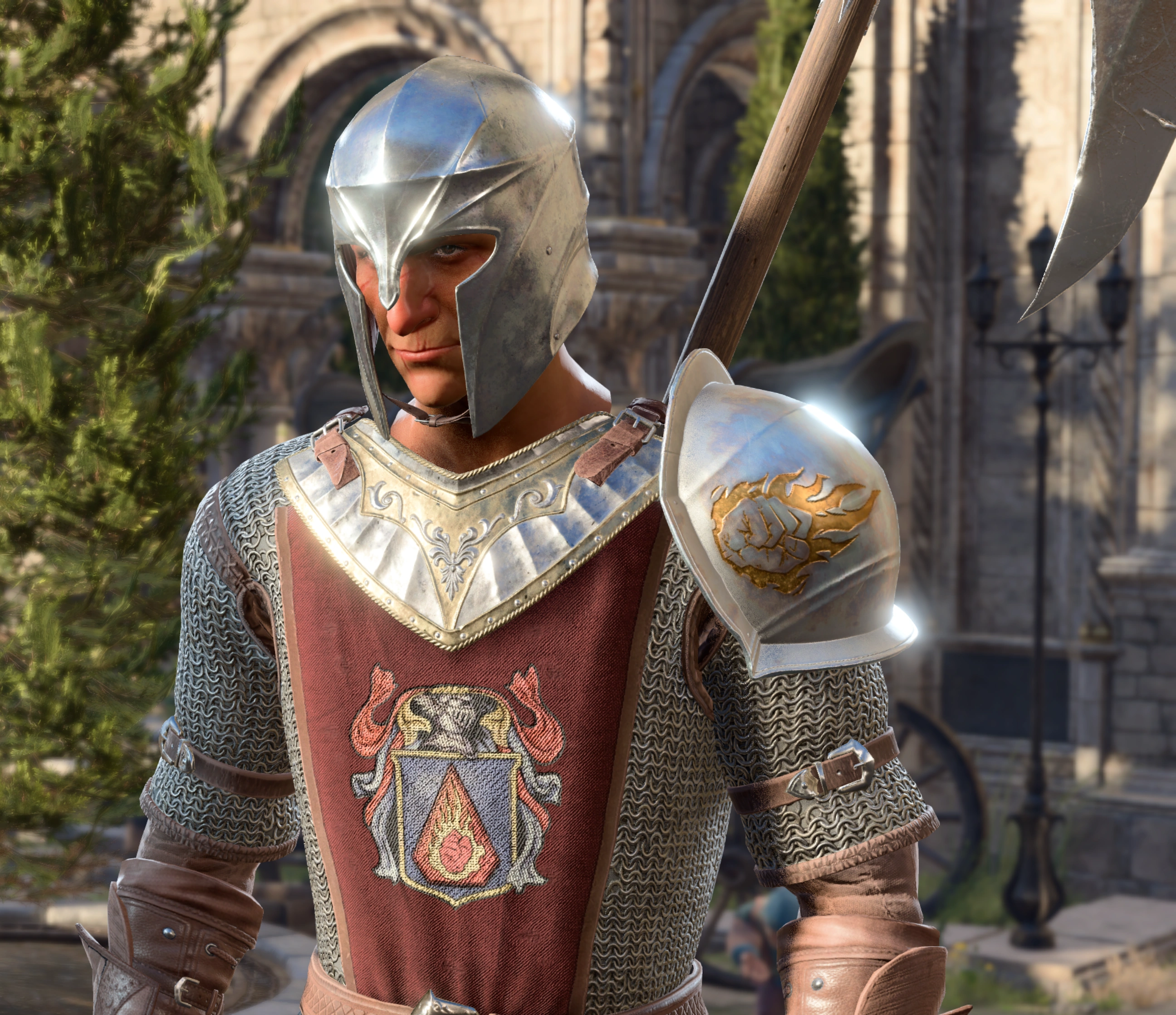 "Edge" was a middle-aged human man with stern expression and face decorated with several scars. He had fair skin and brown yes. He wore a uniform of the Flaming Fist – a helmet, a set of chainmail, and a tabard adorned with the Flaming Fist insignia. He wielded a halberd in battle.[1]