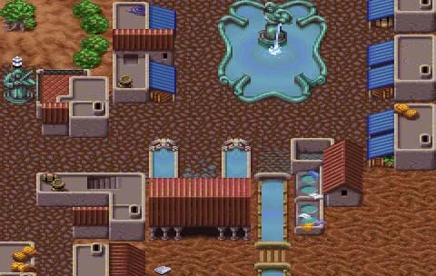 A rounded, blue- or brown-domed keep stood on the outskirts, with its doors flanked by crouching beasts. Northwest of the city was a graveyard, with headstones of greenish stone and crypts. Beside it, in the north, was an array of six statues.[3]