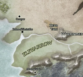 The Wyrmbones mountain range rose high above the plains in the east of Elfharrow, and the River Talar cut through the center before turning southward. North of the river and west of the mountains was the Dead Vale, a desiccated dead forest and all that remained of the elves former jungle home.[1]