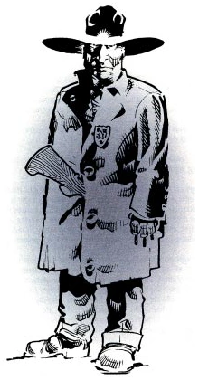 When on the case, he wore a long trenchcoat and broad hat, and displayed a badge bearing his familial coat of arms and affiliation with the Forthright Band of Investigators.[1]