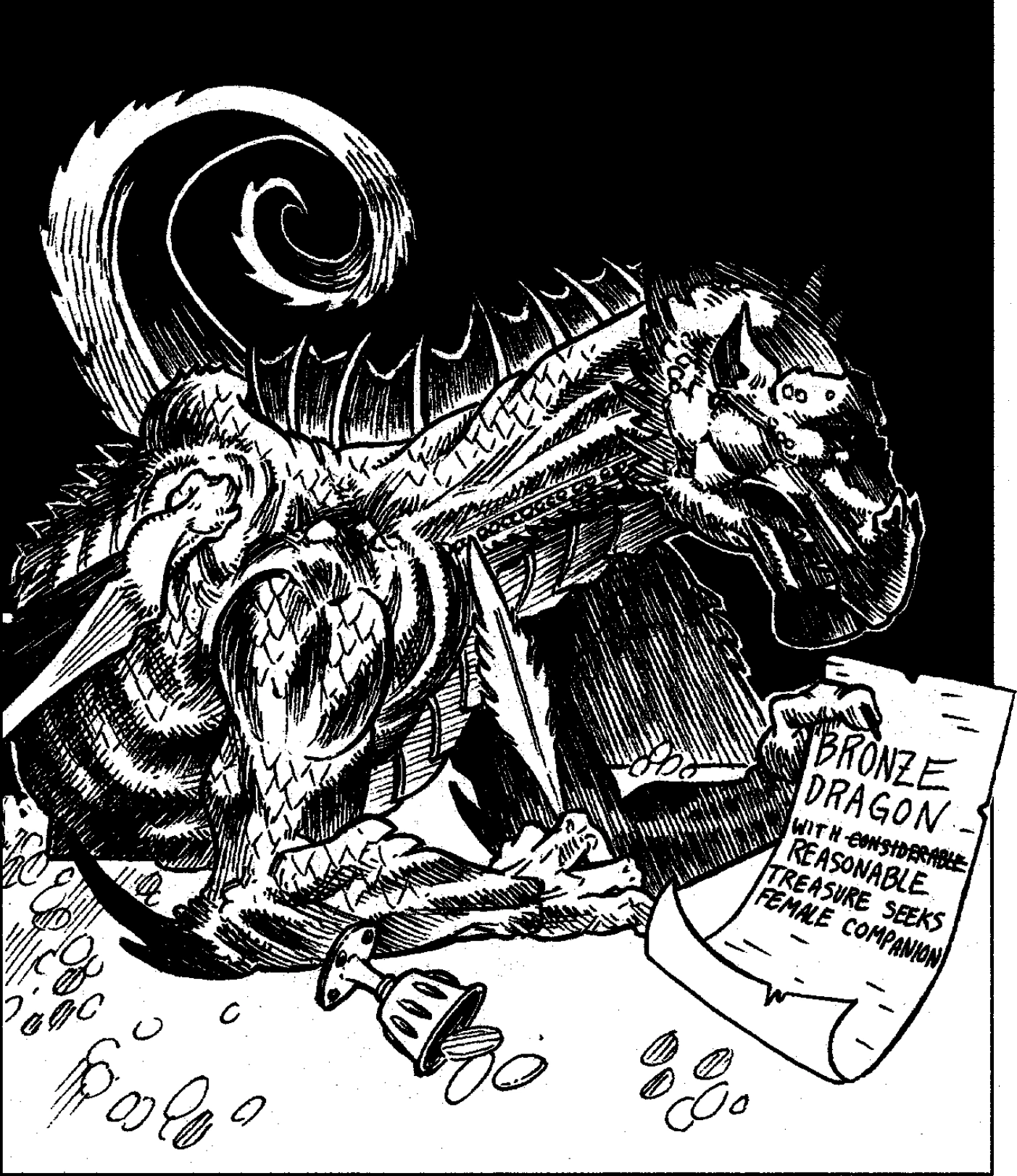 Although some elves had a longer view of the situation, Condor convinced O'Kane to change the terms of the original agreement.[6] They planned to charge Eormennoth a special "dragon tax" and confiscate half of his wealth, even preparing a cube of force and a magic longsword especially powerful against bronze dragons should the negotiations turn sour. However, O'Kane was replaced by Amber Lynn Thoden, and Eormennoth remained in the employ of the city. By 1370 DR, he had protected the vault for over 50 years, and was actively seeking a mate.[1]