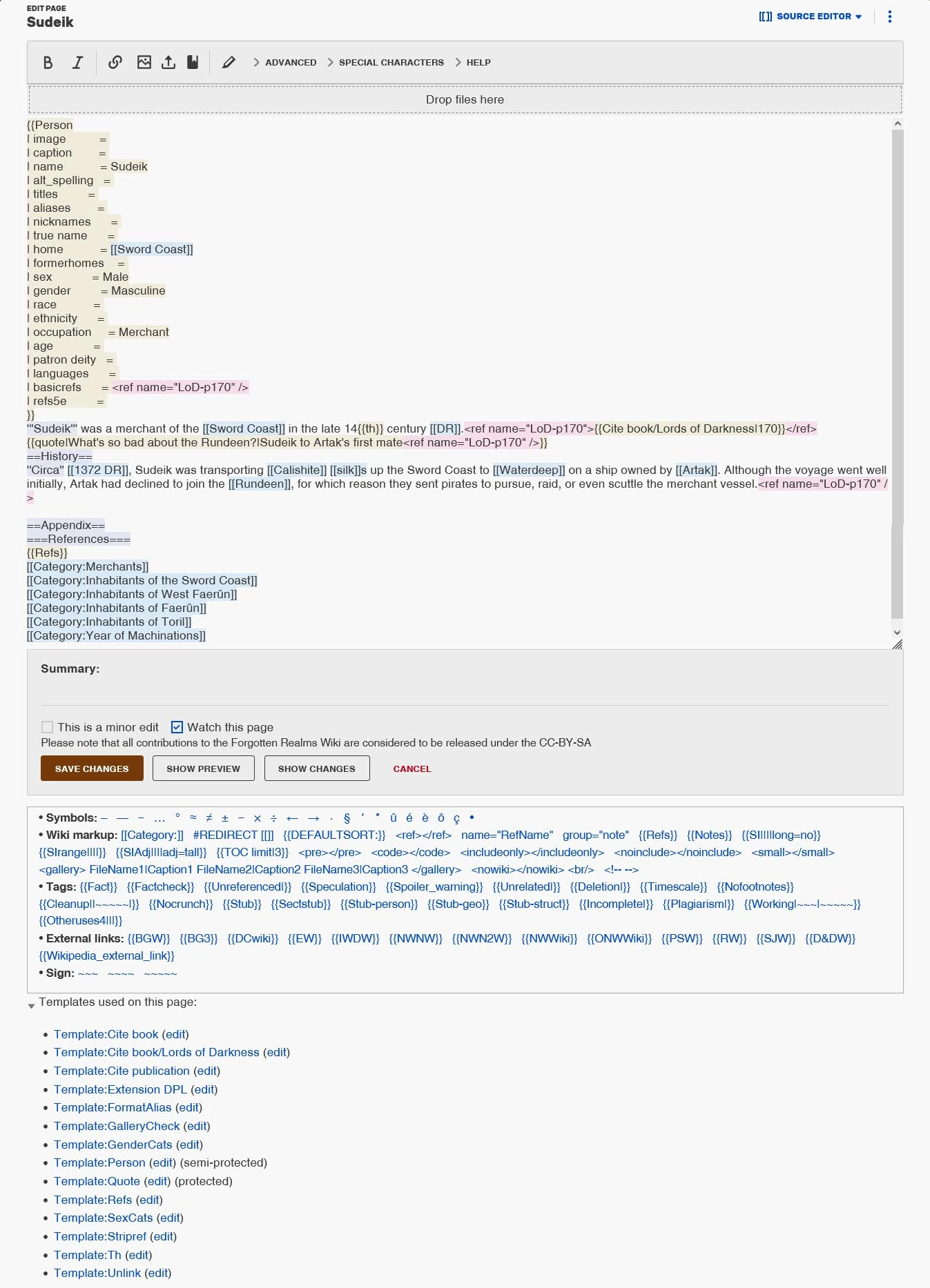 For example, begin by fixing some typos or grammar, correcting errors in lore, or improving some phrasing as you find issues while reading, in order to get used to the editor page, the preview function, and saving your work, as well as to see the wikicode in operation to familiarize yourself. Later, try fixing italics or bolding to see how they work, then try adding a simple template or footnote. After that, you can combine these skills and add a full reference. Next, practice adding a more complex template. At some point early on, make an account with FANDOM so you can set preferences (and avoid advertising!) and we can keep track of your work. Finally, you may be ready to add a paragraph or so of information to an existing page and then add a complete new page to the wiki. If you wish to experiment, use your own User page or subpage as a sandbox.