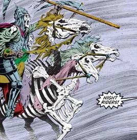 During the Time of Troubles in 1358 DR, in Cormyr on Eleasias 28, the avatar of Myrkul raised thirteen bodies of a patrol of Purple Dragons, together with their horses, as night riders mounted on gaunts. They were led by their former sergeant, Ogden the Hardrider. Myrkul sent them into Hermit's Wood to kidnap Midnight and seize one of the Tablets of Fate as her party camped, and kill the rest. However, the adventurers managed to defeat the undead.[2][3] Later, in early Eleint, as the adventurers crossed the Tun Plains, Myrkul sent sixteen night riders on gaunts to suddenly charge them out of the night.[4]