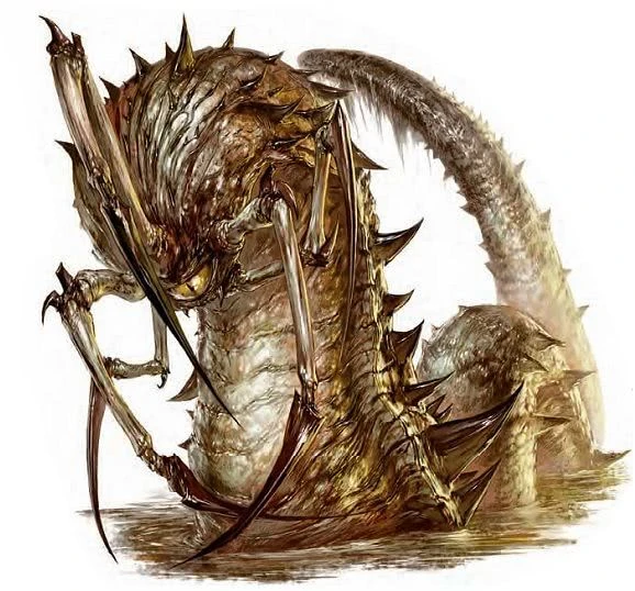 Golothomas were also associated with Sertrous,[2] an obyrith lord initially linked to parasites and crawling things but who later became a patron of serpents.[4] Though Sertrous's minions used them as guards, the connection between them was partially accidental, a result of their coincidental physical similarities. A snake was the closest analogy the mortal mind could conjure to try and describe the maddening form of Sertrous and golothomas had loosely snake-like traits. Though Sertrous was trapped in a near-dead state, the closer he came to resurrection, the more prevalent golothomas would become. They, along with various other serpentine monsters, would herald his arrival, bursting out of the earth in a torrent of infestation, and they would appear with increasing frequency in the bottomless lakes and poisoned marshes of the Hungry Tarns, formerly Sertrous's layer of the Abyss.[2][5]