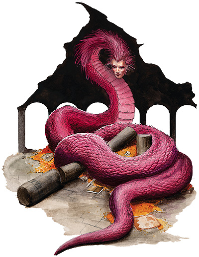 Ha-nagas were 100‑foot-long (30‑meter) serpentine creatures with the head of a classically beautiful human. They had no set coloration, with their scales instead changing color to match its surroundings like a chameleon.[1]