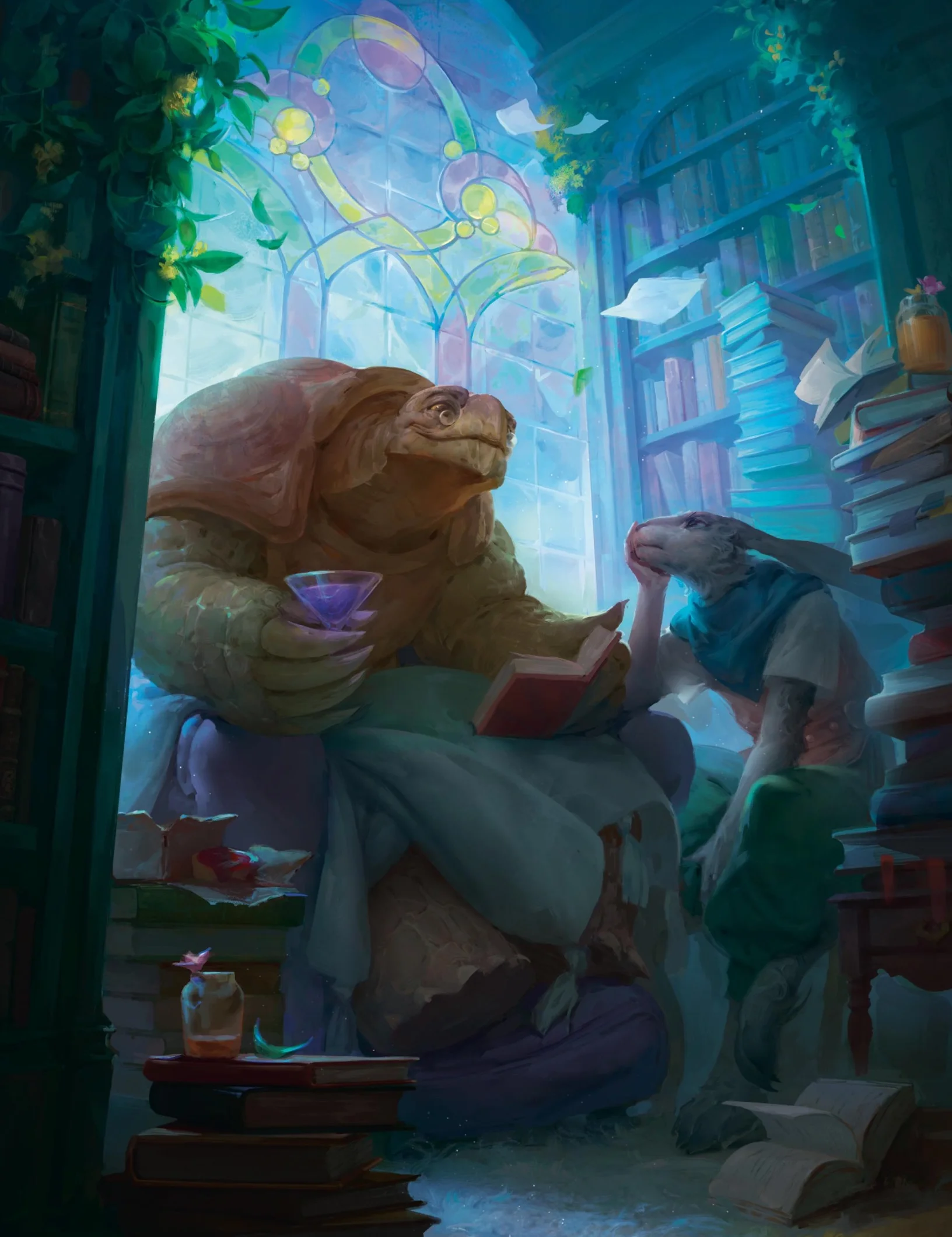 A harengon enjoys the company of a tortle at the Hearth in Candlekeep.