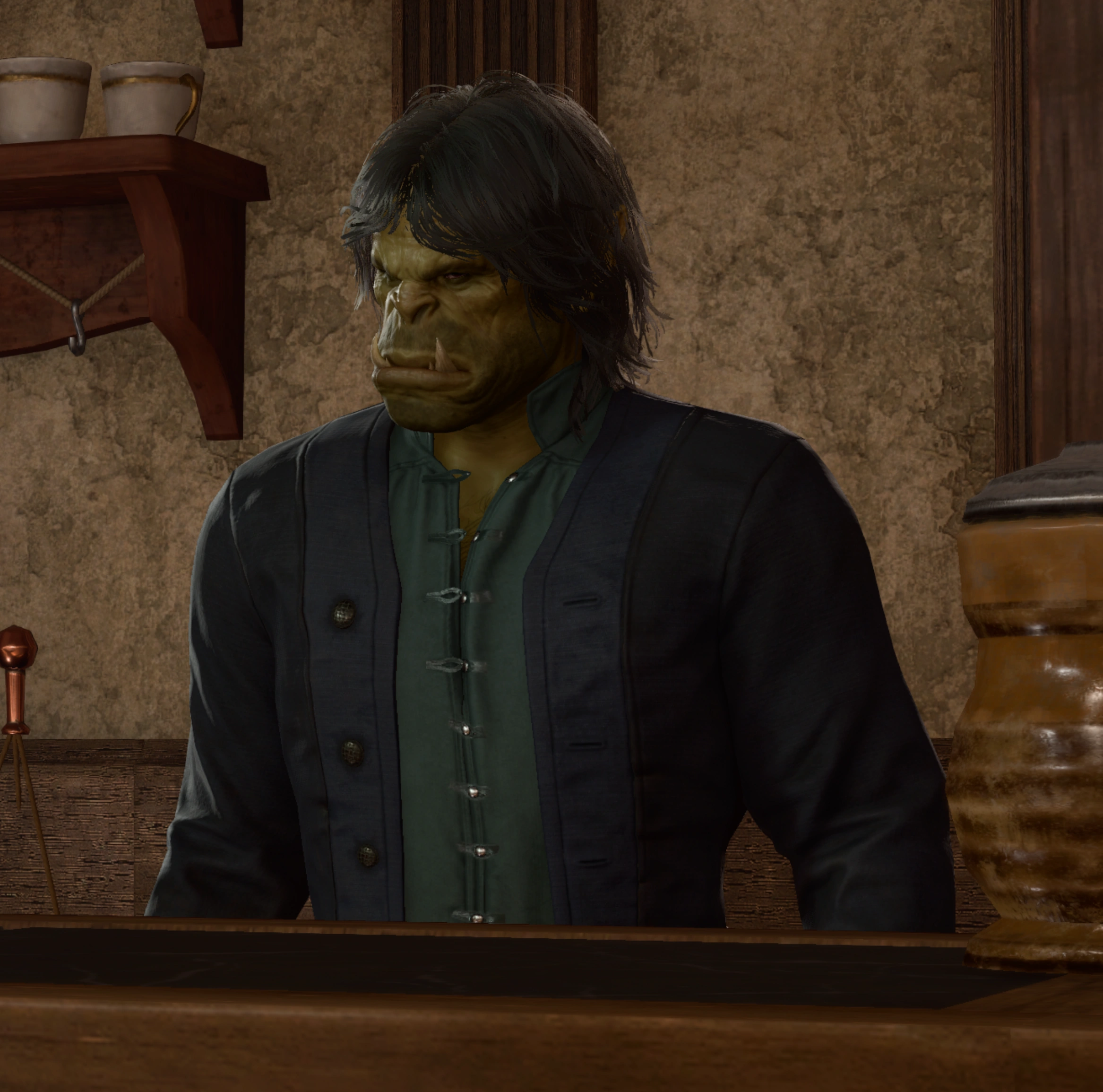 Tender Henk was a gruff and unfriendly half-orcish man with a shaggy mop of black hair. He offered sub-par service to the tavern's guests.[1]