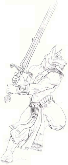 Hound archons were able and determined combatants in melee, thanks to their musculature and meaty fists. They preferred their natural weapons,[2][3][4] but were also known to wield greatswords to great effect.[2] In close range, a hound archon was adept enough to strike a couple times with its fists and also take a bite at its opponent in rapid succession.[5][3]