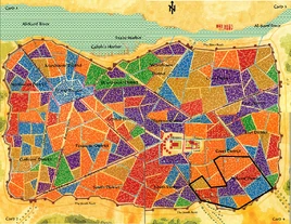 - ↑ 2.0 2.1 2.2 2.3 Maps included in David C. Sutherland III (1993). “The City of Delights, Golden Huzuz”. City of Delights (TSR, Inc). ISBN 1-56076-589-5.