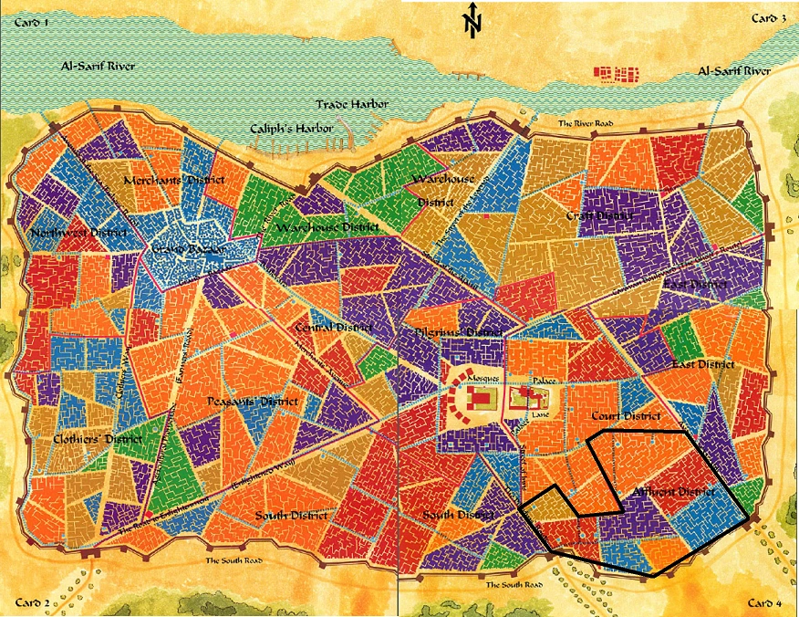 Nestled in the southeast corner of Huzuz against the city walls, the Affluent District was found in the Palace Quarter and was one of the smaller city districts. This district was bordered by the South District to the west, the Court District to the northwest, and the East District to the north and northeast. Two major roads ran parallel on either side of the Affluent District; the Avenue of Wealth on the east side and the Pilgrims' Route on the west side.[1][2]