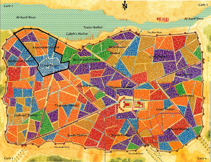 - ↑ Cardsheets included in Tim Beach, Steve Kurtz (1993). “Card 1: Merchants' District, Northwest District, Warehouse District, Central District, and Grand Bazaar”. City of Delights (TSR, Inc). ISBN 1-56076-589-5.