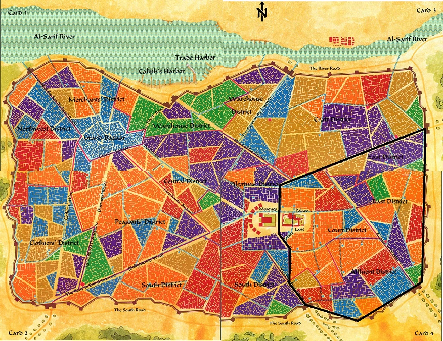 The Palace Quarter encompassed the Affluent District, Court District, and the East District, forming most of the central and southeast portions of the city. This quarter was the home of the wealthiest and most powerful figures in Huzuz, from the Grand Caliph and his court to lavish merchant families and the mysterious White Agate.[1][2]