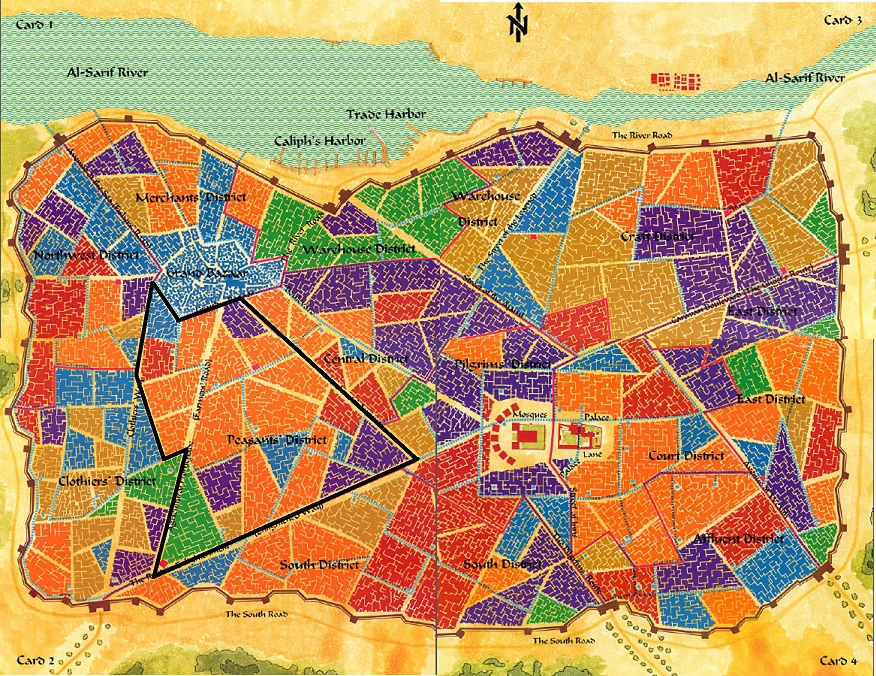 - ↑ Cardsheets included in Tim Beach, Steve Kurtz (1993). “Card 2: Clothiers' District, Peasants' District, and South District”. City of Delights (TSR, Inc). ISBN 1-56076-589-5.