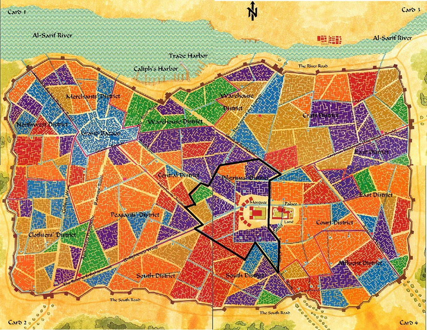 The Pilgrims' District was located in the very heart of Huzuz. It was surrounded by the Central District to the west, the South District to the south, the Court District to the east, and the Craft District to the northeast. This district could be accessed directly by the Pilgrims' Route, the Merchants' Avenue, the Street of the Ajami, the Street of the Inns, the Ghost's Route, the Grand Bazaar Boulevard, and the Enlightened Way.[3][4]