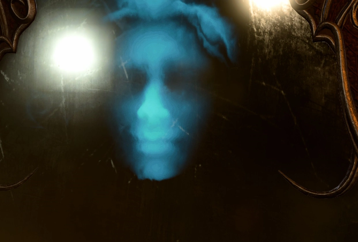 The spectral face on the mirrored door that hid away Toth's underground laboratory.
