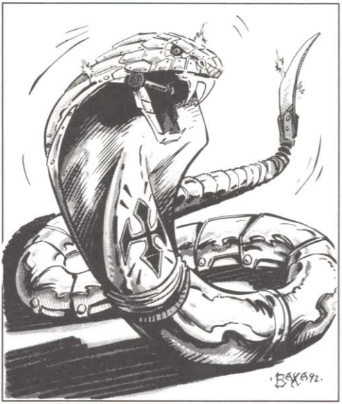 - Spike Y. Jones (December 1990). “The Mechanics of the Iron Cobra”. In Roger E. Moore ed. Dragon #164 (TSR, Inc.), pp. 72–78.