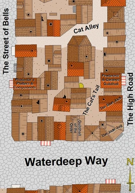 The Jade Jug was located in the far southeast section of Waterdeep's Castle Ward on the northwest corner of the intersection of Waterdeep Way and the High Road. The rear of the inn sat on the Cat's Tail.[3][4][5][6]