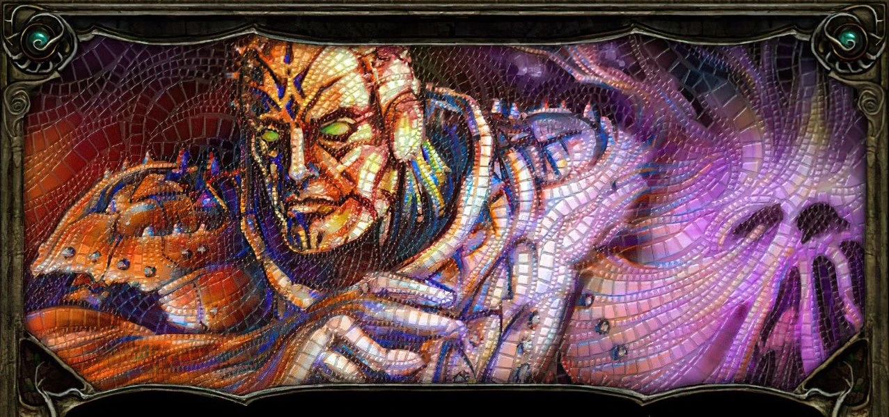 A mosaic depicting Jon Irenicus weaving a spell.
