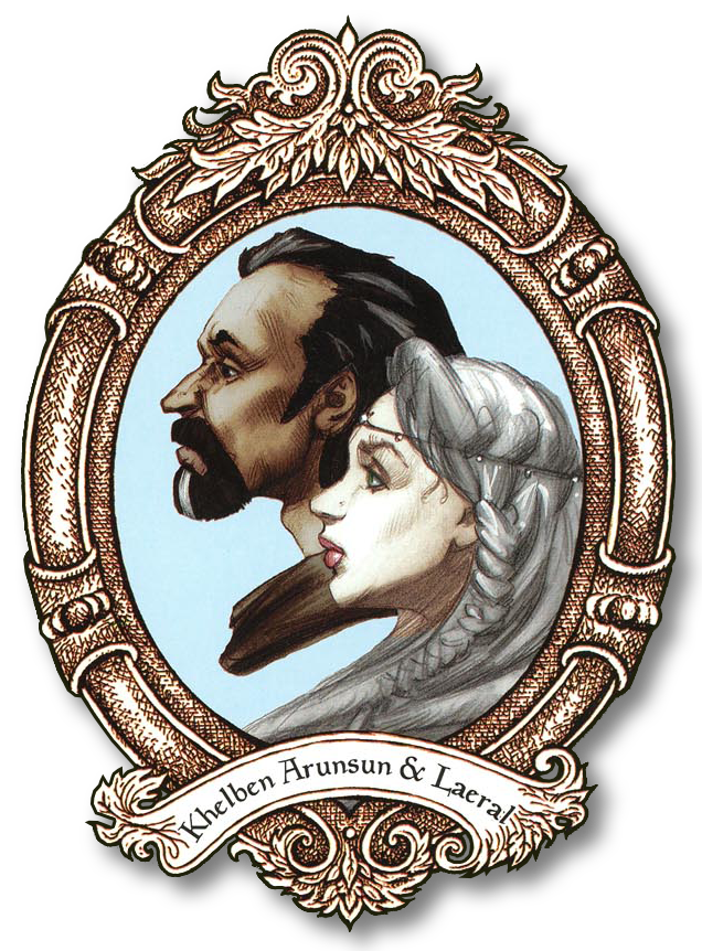 "Khelben's lady" was Laeral Silverhand of the Seven Sisters, whom he rescued in 1357 DR from the grip of the Crown of Horns and the part-dead god Myrkul and spent three years nursing back to sanity in Blackstaff Tower.[58] They had a permanent link that they used to communicate with one another remotely.[17] In later years, the two were often apart, with Laeral spending a great deal of time away adventuring while Khelben remained in Waterdeep mired in politics and diplomacy.[59] In 1361 DR, Danilo Thann moved the elfgate portal to Evermeet to Laeral's quarters in Blackstaff Tower with the hope that the two would be able to spend more time together.[60]