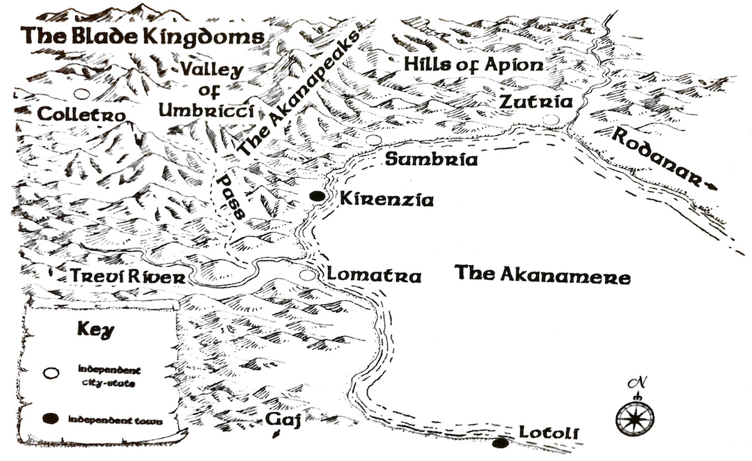 Kirenzia stood to the south off the grandest city-state of the Blade Kingdoms - Sumbria. Both settlements were located on the lush shores of the Akanamere, in the rolling green foothills of the Akanapeaks.[1]