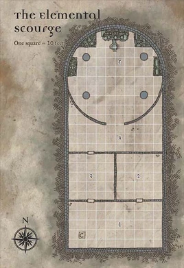 The last chamber housed the massive Elemental Scourge, which dominated the 50 feet (15 meters) wide and 30‑foot (9.1‑meter) tall domed circular room.[5] This chamber contained four statues, each depicting a huge elemental—one each of air, earth, fire, and water—to represent the monsters that the Scourge could conjure.[1][6] The room's walls were decorated with frescoes of massive and intimidating ice creatures obliterating hapless victims. Unlike the rest of the House—which was unlit—magical yellow light radiated dimly from alcoves along the walls.[5]