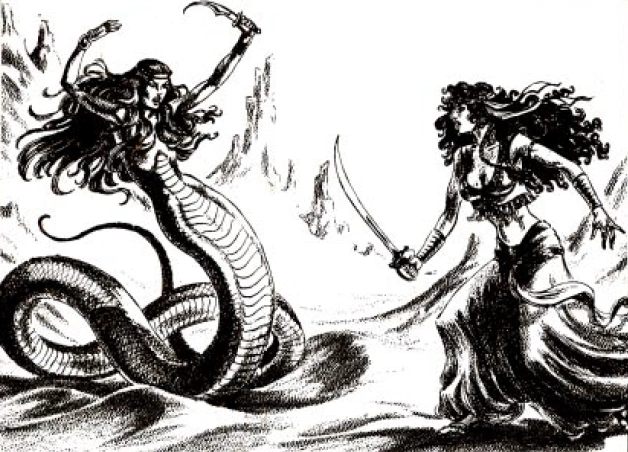 A Bedine sorceress battles a lamia noble in the desert of Anauroch.