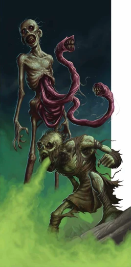 These undead were physically distinct from other zombies in that they had emaciated frames, with withered flesh that stretched taut over their brittle bones. The lower half of their torsos were opened and had writhing, pulsating intestines hanging out of it that swayed like snakes. At the end of each intestine was a snapping, tooth-filled maw.[1]