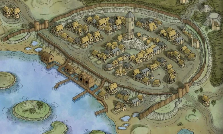 Leilon sat on the edge of a shallow mudflat that extended to the Sea of Swords[2][9] with the crags of the Sword Mountains looming over the town.[4] The original town contained many stone cottages with slate or thatched roofs, the latter covered with hardened mud.[2] As the town was rebuilt in the late 15th century DR, much of the initial buildings were simple wooden constructions.[10]