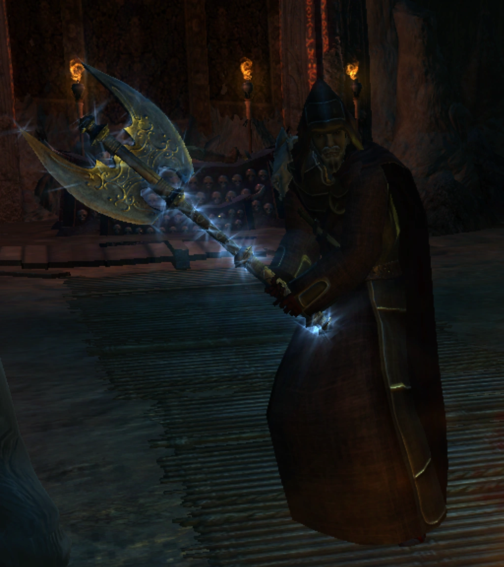 The Mad Hermit was an old human man dressed in simple tattered robes permanently stained with browned blood stains. Underneath his robes, the man wore enchanted +2 scale mail and wielded a magic +3 greataxe.[1]