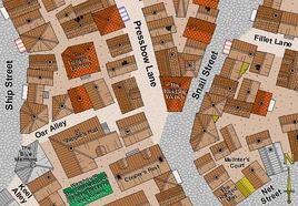 Melinter's Court was located in Waterdeep's Dock Ward. The buildings forming the court were enclosed by Snail Street to the southwest and northwest, and by Net Street to the southeast. The courtyard's main entry point was from an unnamed alley to the north.[1][2][3][4]