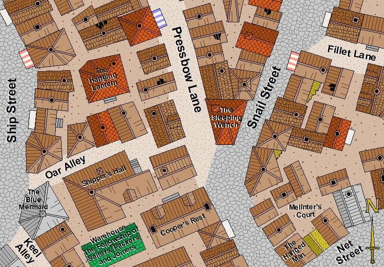 The rear face of the Hanged Man tavern faced Melinter's Court.[4]