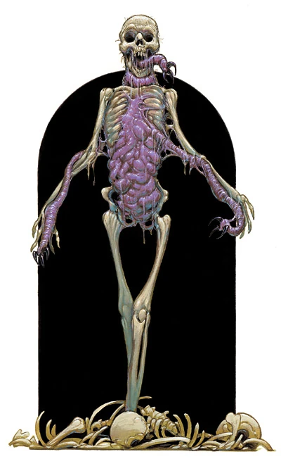 Mohrgs were vile undead creatures that took the form of skeletons containing only their animated viscera, including a tongue-like organ with a paralyzing touch. They arose from the bodies of unrepentant mass murderers and were driven by a desire to continue their killing and by a hatred for the living.[1][2][3]