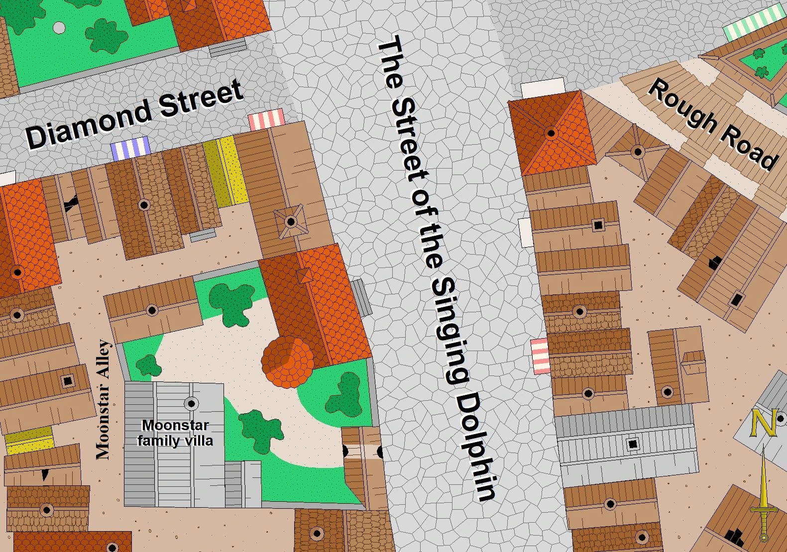 Moonstar Alley was located in the central section of Waterdeep's Sea Ward. The alley cut between the Street of the Singing Dolphin and the Street of Whispers, enclosing the Moonstar estate and several other buildings. Another alley called Sharra's Flight connected with the southern side of Moonstar Alley.[1][2][3][4]