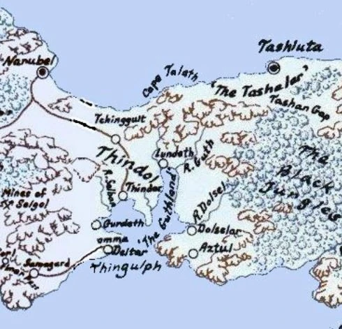 Narubel was located in the far northwest corner of Thindol along the coast of the Shining Sea near the border of Chult, making it the most remote of Thindol's settlements.[2][1]